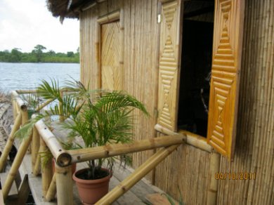 La cabaña, que cuenta con capacidad para cuatro personas, fue construida a base de bambú. Varios porches la rodean, con el objetivo de que el turista pueda disfrutar del paisaje de la laguna y su fresca brisa a cualquier momento del día y desde cualquier ángulo.
